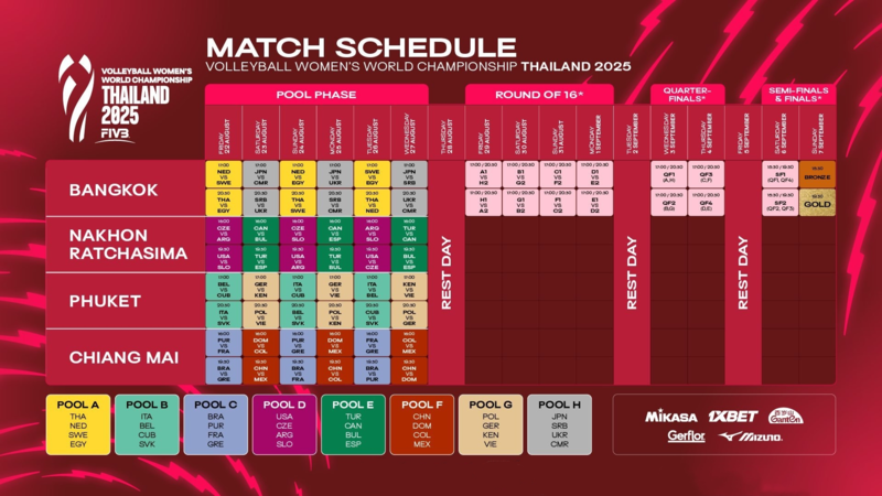 赛事将于8月22日至9月7日在泰国举行。根据赛制,小组前两名进入16强淘汰赛,F组前两名将与巴西所在的C组前二名进行交叉淘汰赛。小组赛分组情况如下: