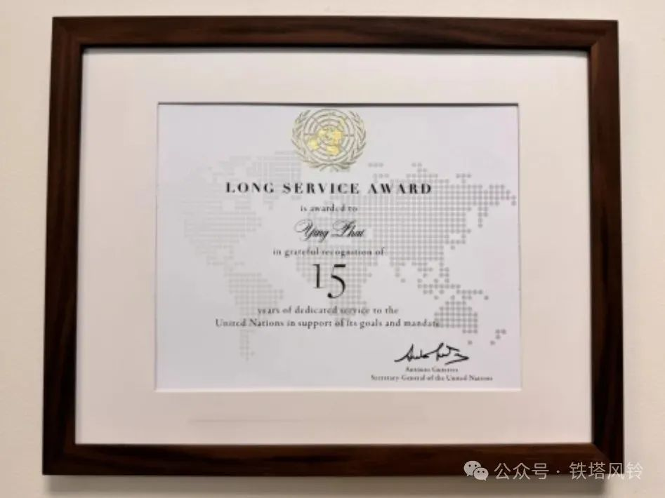 翟莹荣获联合国秘书长颁发的15年长期服务奖。这一奖项旨在表彰多年来始终坚守岗位、忠诚奉献、尽职尽责,为联合国事业以及全球和平与发展做出不懈努力的联合国工作人员。