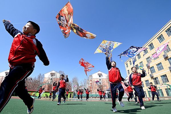 河北邯郸:学生操场放风筝 蓝天下飞舞童趣