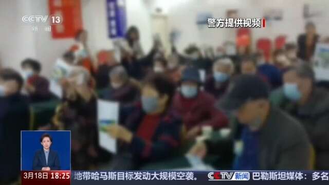 警方提供的一段视频显示,几十位老人在店员的指引下举起手中彩色的宣传页和纸币。