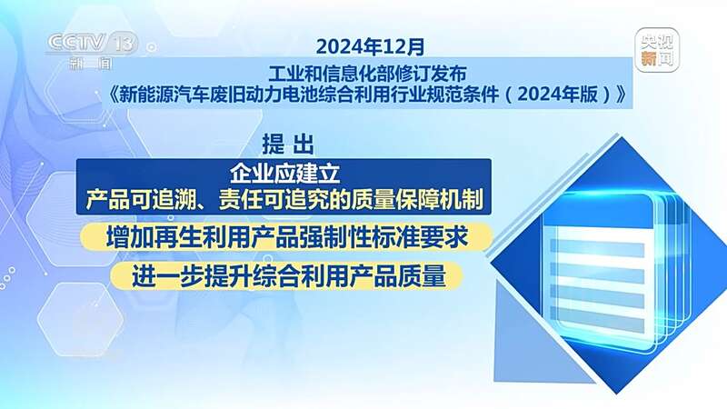 2024年12月,工业和信息化部修订发布了《新能源汽车废旧动力电池综合利用行业规范条件(2024年版)》。要求企业在冶炼过程中,锂回收率从85%提高至90%,电极粉料回收率不低于98%,杂质铝含量需低于1.5%等。引导企业强化技术创新,提升工艺水平。同时提出企业应建立产品可追溯、责任可追究的质量保障机制,增加再生利用产品强制性标准要求,进一步提升综合利用产品质量。