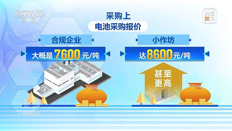 采购上,合规企业的电池采购报价大概是7600元/吨,而非合规的小作坊采购报价可达8600元/吨,甚至更高;