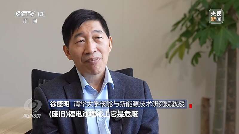 清华大学核能与新能源技术研究院教授 徐盛明:废旧锂电池理论上是危废,因为它有35种化合物,里面有7种是危险化学品,是危险废物。锂离子电池真正的污染是在拆开的时候,里面的电解质六氟磷酸锂见了水蒸气以后,会分解成氟化氢进入空气。