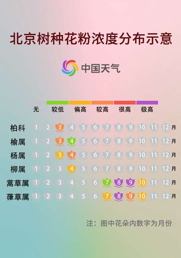 同一个地区,春秋季花粉过敏的过敏原并不相同。大城市中,以北京为例,常年3月诱发花粉过敏的树种主要来自柏科和榆树种,到了4月,杨树和柳树种花粉浓度也会升高,诱发花粉过敏的风险升高;而秋季花粉过敏的过敏原则来自蒿草属、葎草属的草类。