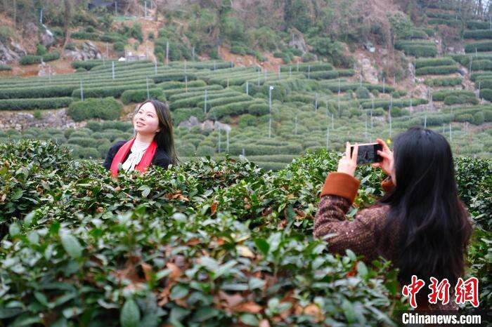 2025年3月5日,游客在杭州西湖茶园内拍照。曹丹 摄