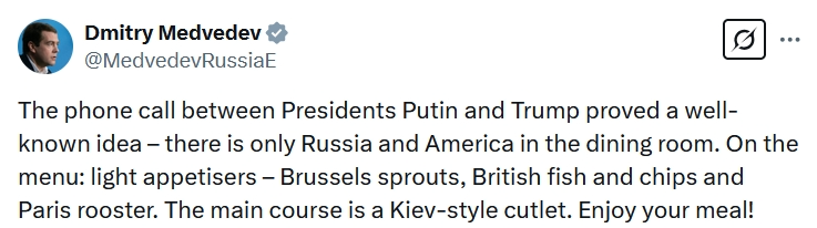梅德韦杰夫在社交媒体上用英文写道:“普京总统和特朗普总统的通话证明了一个众所周知的想法——餐厅里只有俄罗斯和美国。菜单上有:开胃小菜——布鲁塞尔芽菜、英式炸鱼薯条和巴黎公鸡。主菜是基辅炸肉排。祝您用餐愉快!”