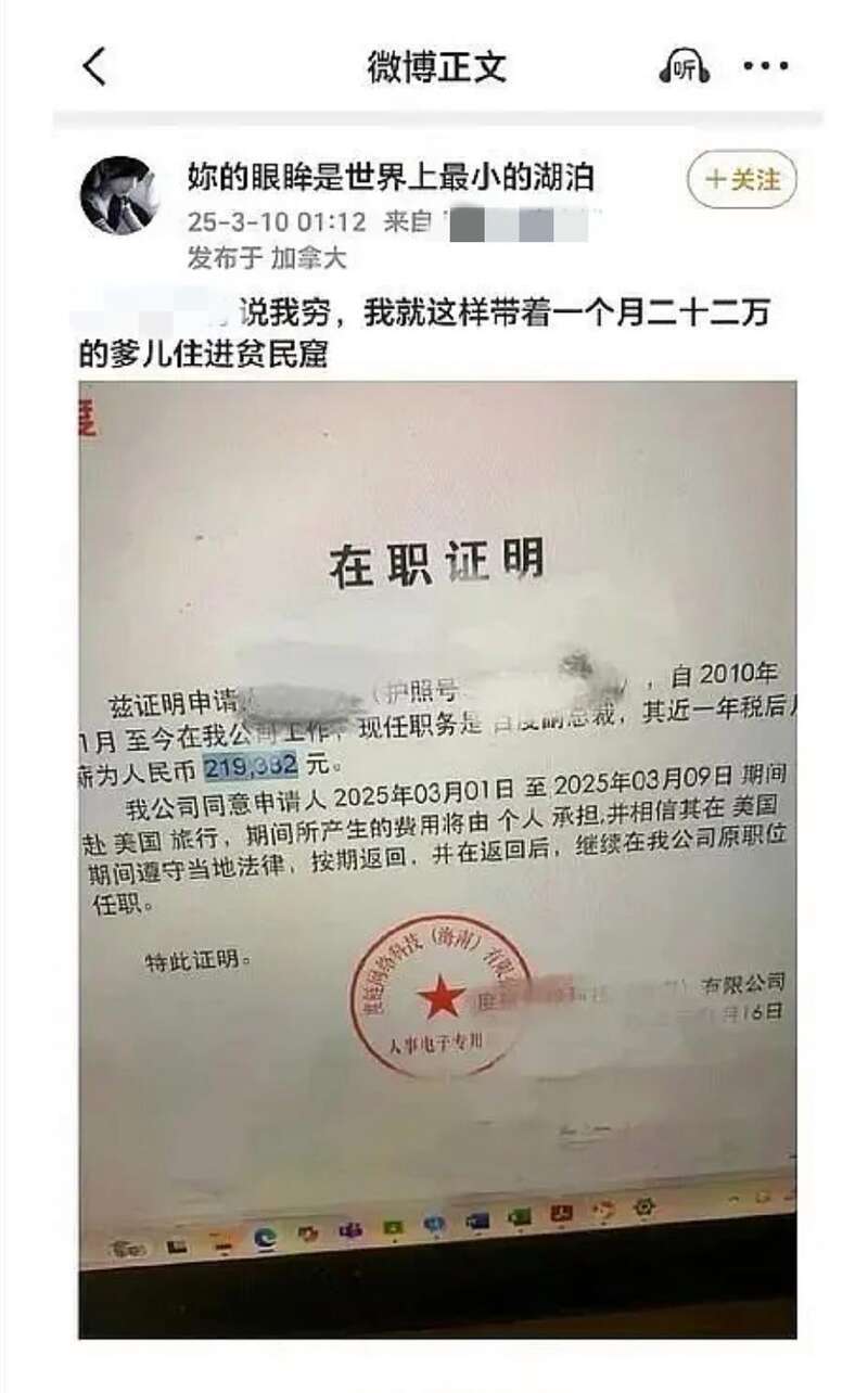 很快,网友就根据这张 " 在职证明 " 上的公司名称与入职时间,结合 " 眼眸 " 多个社交账号上发布的信息,推断其真实身份为百度副总裁谢广军的女儿,目前 13 岁,在加拿大留学。