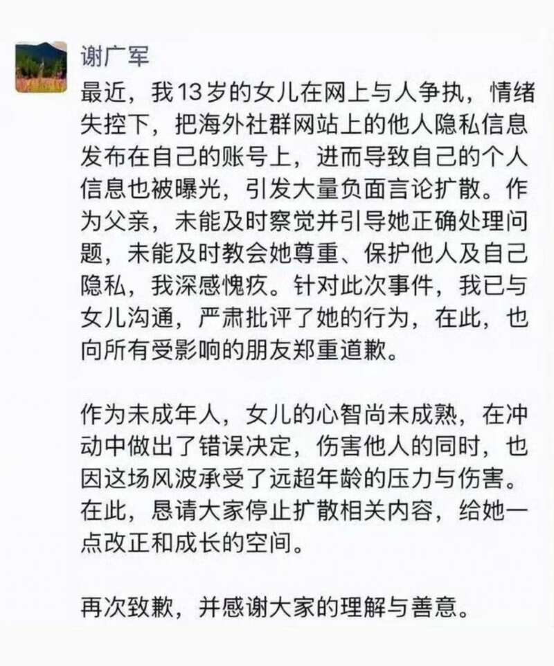 3 月 17 日,谢广军发声:" 我 13 岁的女儿在网上与人争执,情绪失控下,把海外社群网站上的他人隐私信息发布在自己的账号上,进而导致自己的个人信息也被曝光,引发大量负面言论扩散 …… 向所有受影响的朋友郑重道歉。"