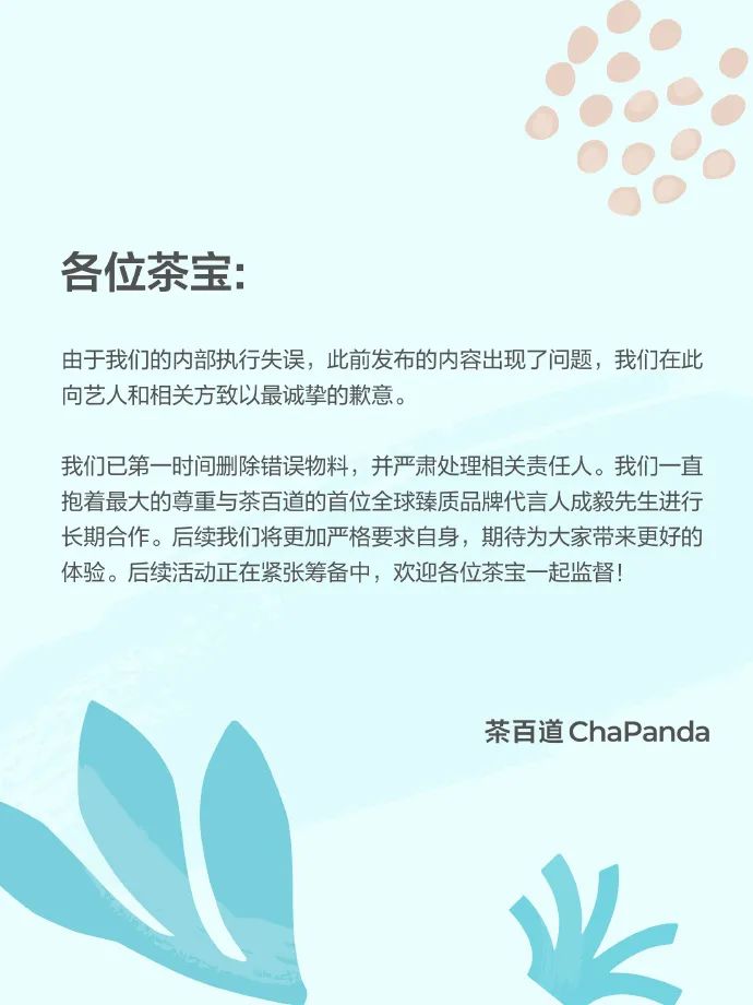 我们已第一时间删除错误物料,并严肃处理相关责任人。我们一直抱着最大的尊重与茶百道的首位全球臻质品牌代言人成毅先生进行长期合作。后续我们将更加严格要求自身,期待为大家带来更好的体验。后续活动正在紧张筹备中,欢迎各位茶宝一起监督!