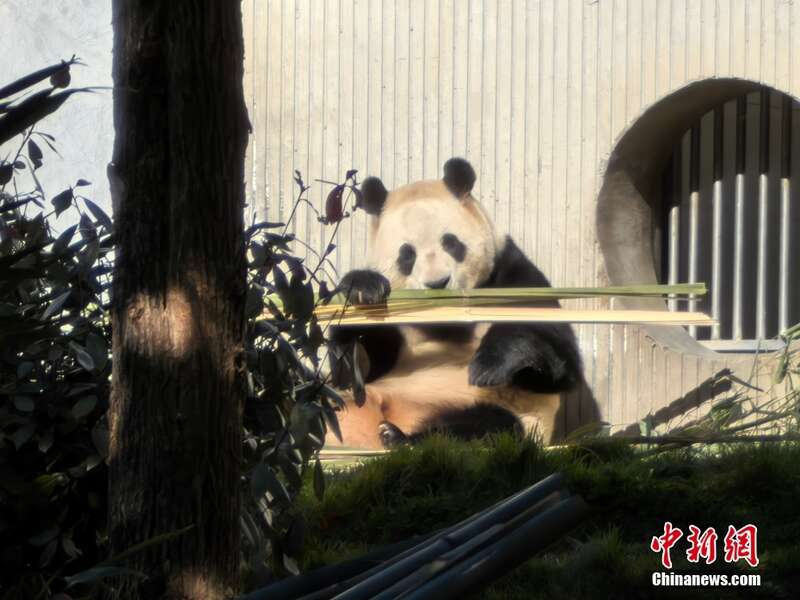 3月25日上午,大熊猫“福宝”在中国大熊猫保护研究中心卧龙神树坪基地幼儿园2号馆203圈舍复展,这是“福宝”2025年首次对外展出。