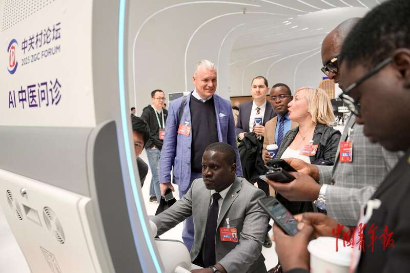 3月27日,北京,2025中关村论坛年会现场,一名外国嘉宾体验中医智能诊疗设备。中青报·中青网记者 李隽辉/摄