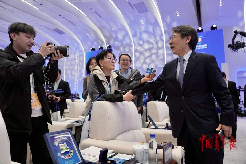 3月27日,北京,2025中关村论坛年会开幕式暨全体会议上,国家最高科学技术奖获得者薛其坤发言结束后,被一名记者紧紧拉住手臂,追问问题。中青报·中青网记者 李隽辉/摄