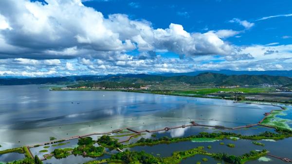 “异龙湖越变越好!”生活在湖畔的大瑞澄村村民吴继有撑着猪槽船,拨开水面漂浮的海菜花。他告诉记者,前些年湖面被蓝藻覆盖时,连划船都要屏住呼吸。“现在水清了,海菜花回来了,我们彝族的海菜腔又能对着清波唱了”。