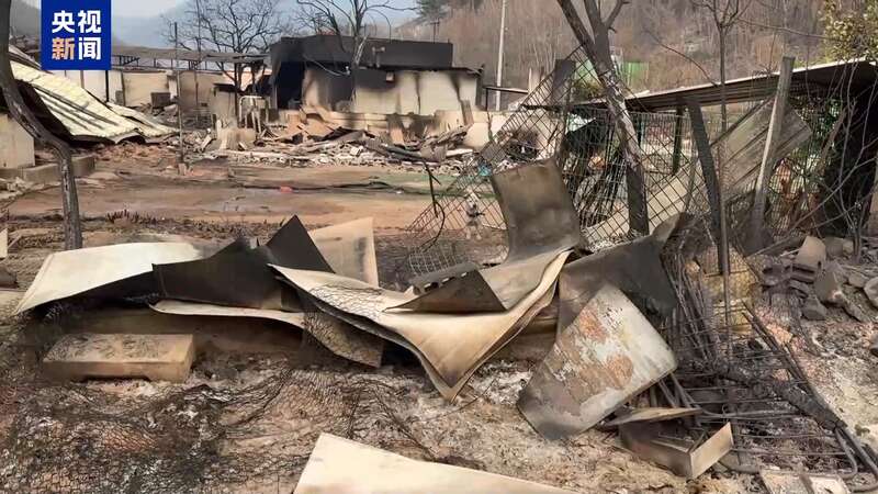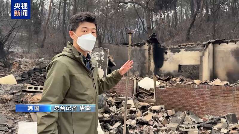 总台记者 唐鑫:在我身后就是庆尚北道安东市近郊的一处村落。通过我们的镜头可以看到,在这场山火中,这个村子大部分建筑已经在大火中被完全烧毁,建筑的砖瓦现在散落一地,我身后的树林也有明显的过火痕迹。我们来到这里的时候,村子里的人员已经被疏散到了临近的安置点,所以我们在村子里没有看到当地的村民,没有办法直接问他们火灾来临时的情况。不过从现场随处可以看到的焦黑的痕迹,可以想象火灾来临的时候场景有多么可怕。