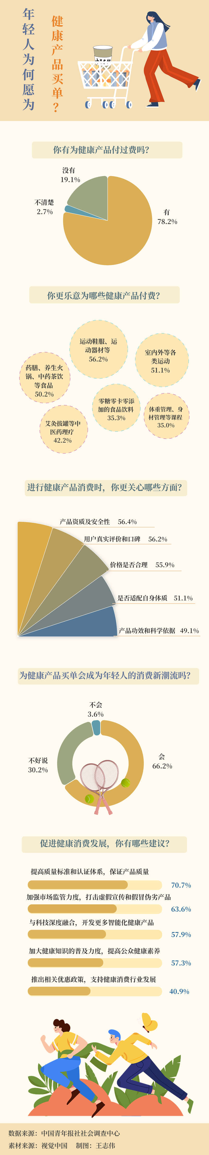营养保健品持续热销,低热量零添加的食品饮料备受追捧,骑行、健身等吸引众多年轻人参与……中国青年报社社会调查中心的一项调查显示,78.2%的受访青年为健康产品付过费,运动健身和中式养生是受访青年更乐意付费的类型。购买健康产品,56.4%的受访青年关心产品资质及安全性,56.2%的受访青年关心用户真实评价和口碑。你为哪些健康产品买过单?