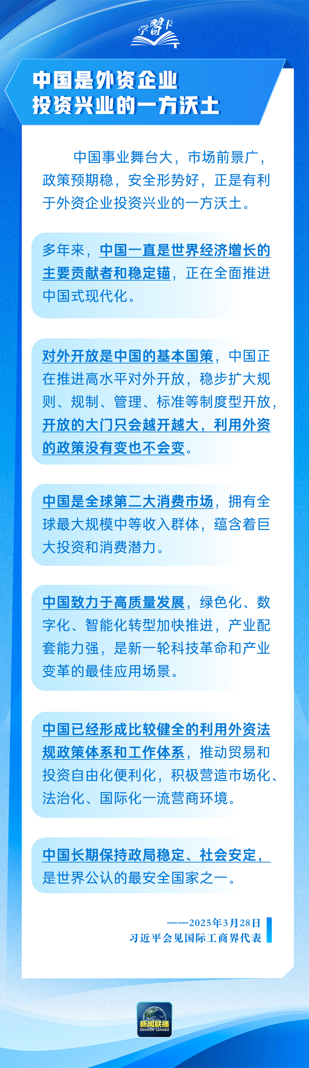 习近平主席强调,中国是有利于外资企业投资兴业的一方沃土,将为外资企业来华贸易投资提供便利,依法保护外资企业合法权益。一起学习↓