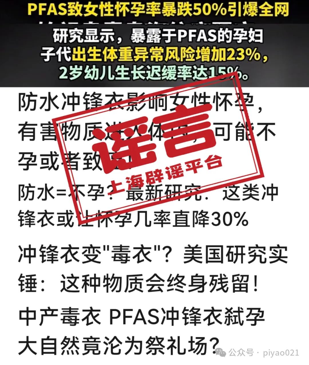 可见,PFAS致癌以及对怀孕女性有不良影响的结论,都有限制条件——大剂量、高暴露。但没有任何一项研究指出,穿着面料含有PFAS的冲锋衣会导致PFAS大剂量进入人体引发相应的不良后果。然而,网络传言只引用研究结论,却有意无意忽略限制条件,加上部分自媒体的歪曲解读或以讹传讹,最终演变出了“穿防水冲锋衣会导致女性不孕”的荒唐结论。