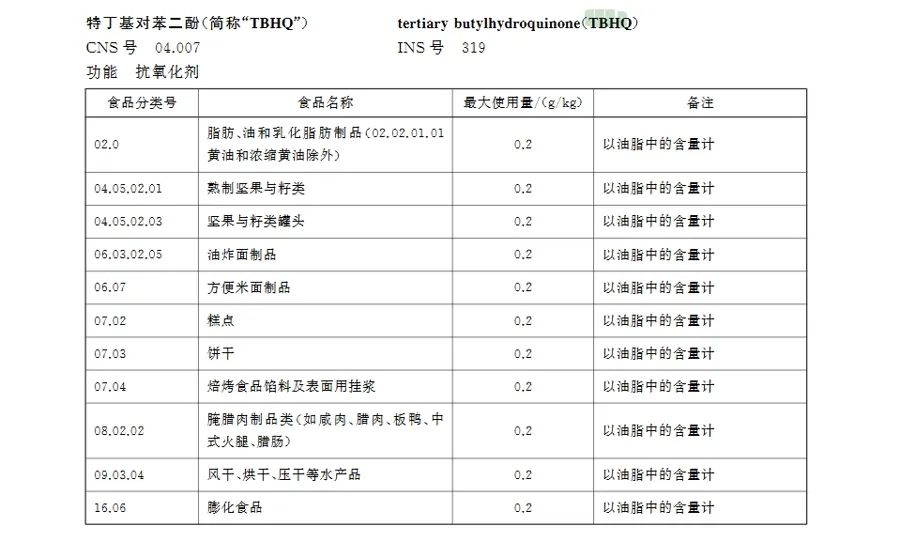 该标准明确,特丁基对苯二酚(简称TBHQ)是一种抗氧化剂,可以在膨化食品、油炸面制品、方便米面制品、糕点、饼干等11种食品中添加,最大使用量为0.2克/千克(以油脂中的含量计)。