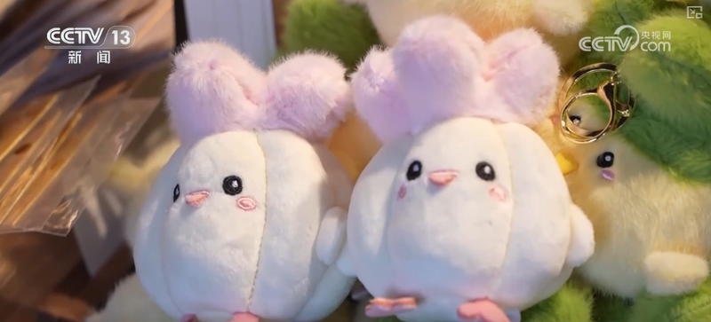这款有着萌趣表情,融合蒜苗和小鸟造型的毛绒玩具叫“蒜鸟”。