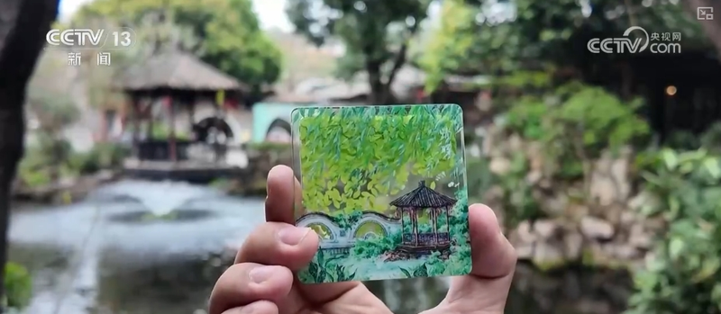 在佛山清晖园博物馆的地标建筑“一勺亭”前,能看到一勺亭、一勺池、云墙和柳树。本土的青年设计师们根据此时春日景象,创新推出了这款“柳叶流麻冰箱贴”。将冰箱贴缓缓倒置,就能看到流沙缓缓流动,仿佛微风拂柳的灵动景致再现在眼前。