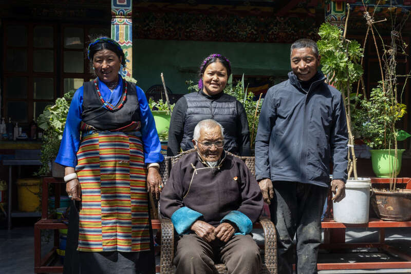 普琼老人(前)与儿子欧珠(后右一)、儿媳曲宗(后右三)、孙女其美拉姆在家中合影(3月17日摄)。