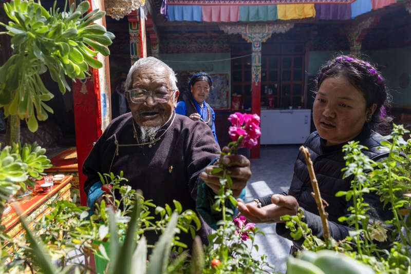 普琼老人(左)在孙女的陪伴下侍弄家中的花(3月17日摄)。