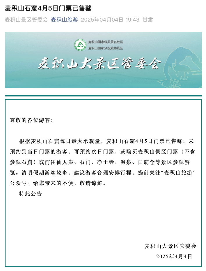 麦积山大景区管委会4月4日中午发布通知称麦积山石窟当日门票已售罄,4月4日19:43再次发布通知称麦积山石窟4月5日门票也已售罄。