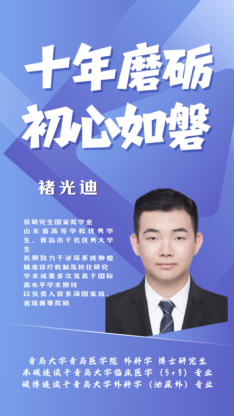 褚光迪,现任青岛医学院研究生会主席、临床博士研究生第二党支部书记,获研究生国家奖学金(3次)、山东省高等学校优秀学生(2次)、青岛市千名优秀大学生、青岛大学优秀共产党员、青岛大学十大学术之星、青岛大学青年创新榜样等荣誉。致力于泌尿系统肿瘤精准诊疗机制及转化研究,以第一/共一发表领域顶刊European Urology(封面论文)等SCI论文12篇,ESI高被引论文1篇,单篇最高24.3分。获中国国际大学生创新大赛全国银奖(2项)、全国铜奖(1项)、山东省金奖(3项)等国家级、省级奖励12项。