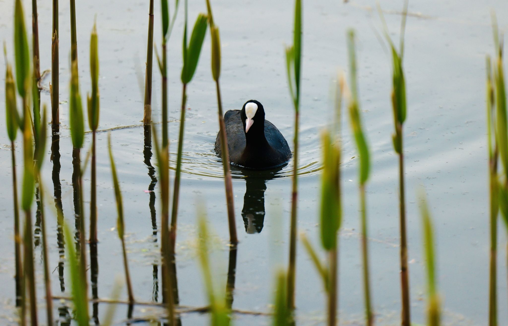 2025年4月6日,北京,玉渊潭公园吸引了大量市民游客前来玉渊潭公园观看“打鸟”景观。一只鸟儿游过水草。