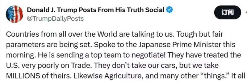 特朗普当天还在社交媒体上公布了其与日本首相讨论关税的消息,并坚称日本在汽车贸易上占了美国大便宜。随后,特朗普也在当天与内塔尼亚胡的记者会上表态,他认为日本需要开放市场。