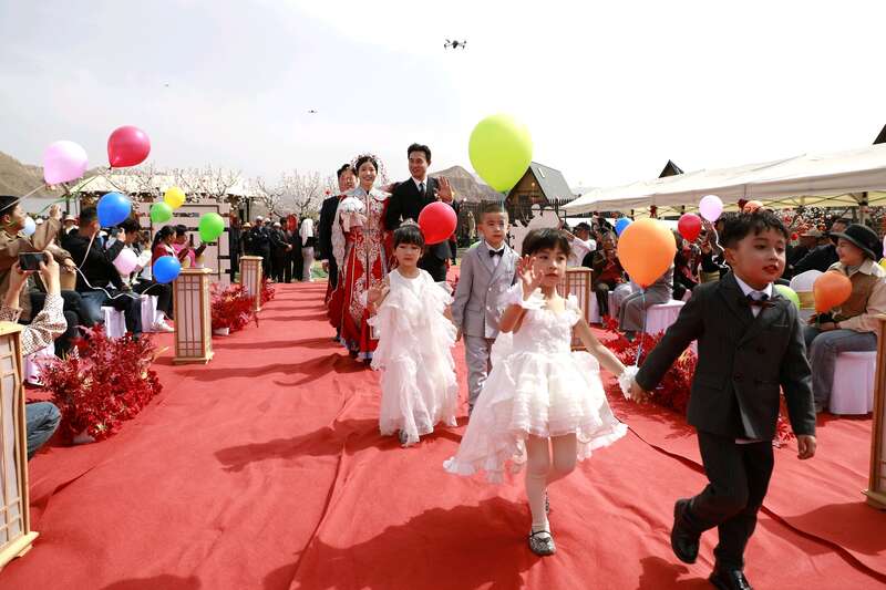 中国青年报客户端讯(中青报•中青网记者马富春)4月8日,甘肃东乡县的万亩杏林成了一片浪漫的海洋。“杏花为媒·缘定东乡”东乡县“树新风 倡文明”首届集体婚礼在这里温馨启幕。20对新人以花为媒,在烂漫杏花下许下相伴一生的承诺,同时倡导“零彩礼”“低彩礼”,引领移风易俗的文明婚嫁新风尚。