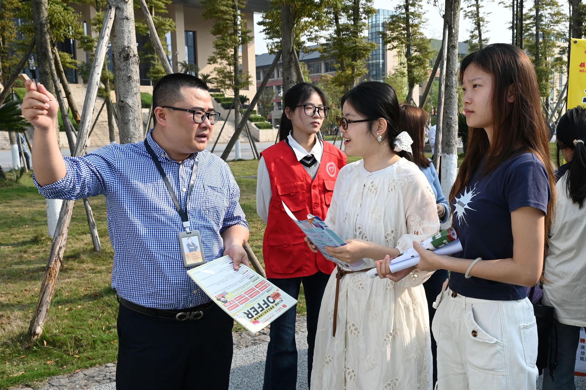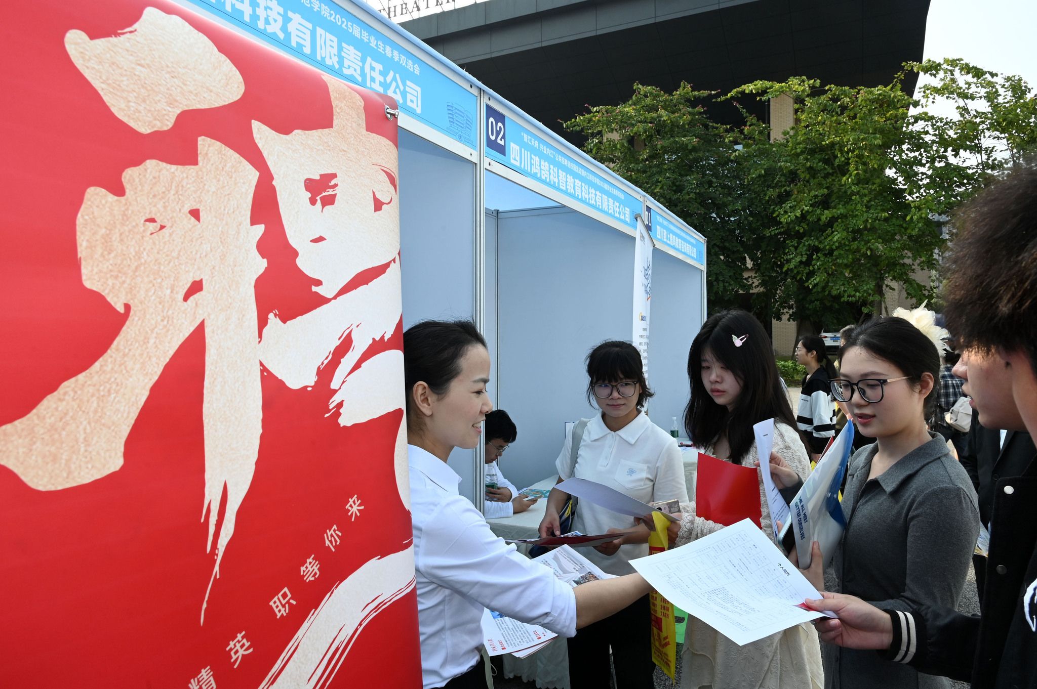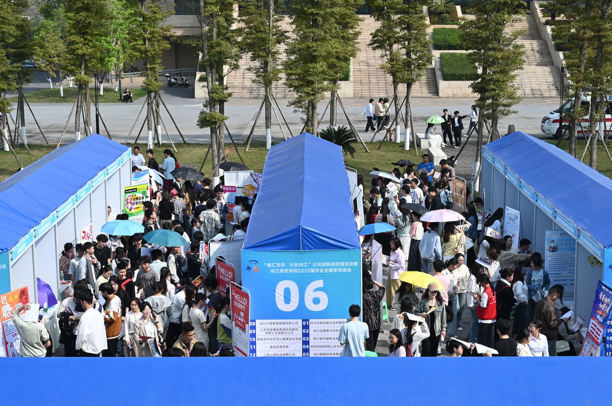 2025年4月10日,四川省内江师范学院,公共招聘进校园活动现场,应届毕业生与用人单位工作人员进行面对面交流。