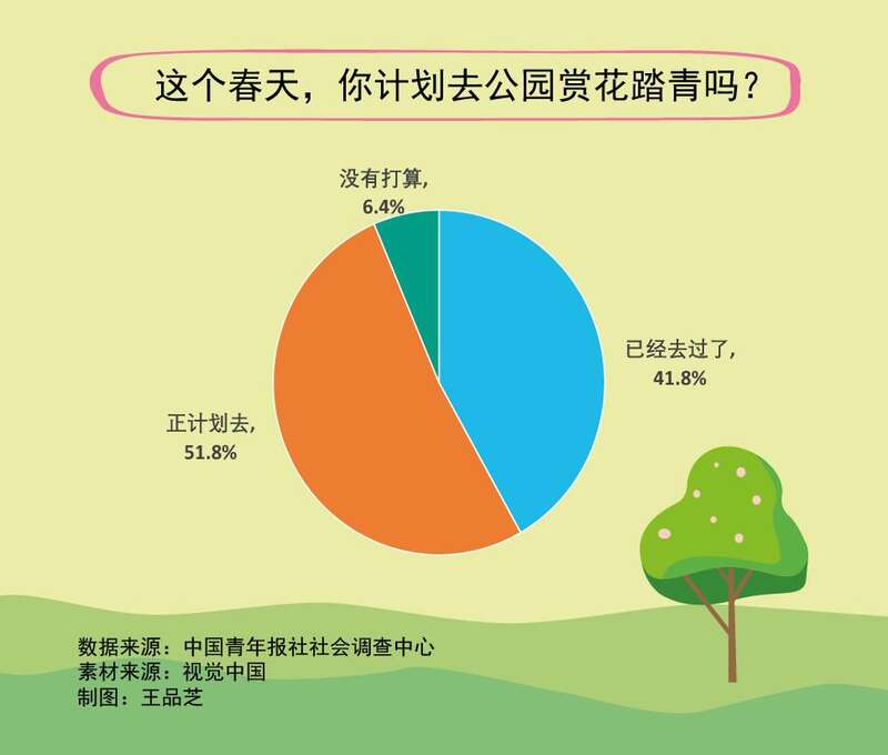 调查显示,这个春天,93.6%的受访者计划去公园赏花踏青,其中41.8%的受访者已经去了。