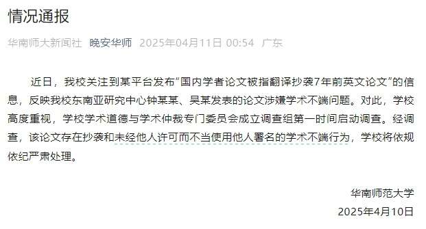 4月11日,就某平台发布“国内学者论文被指翻译抄袭7年前英文论文”一事,华南师范大学官方微信发布通报。全文如下: