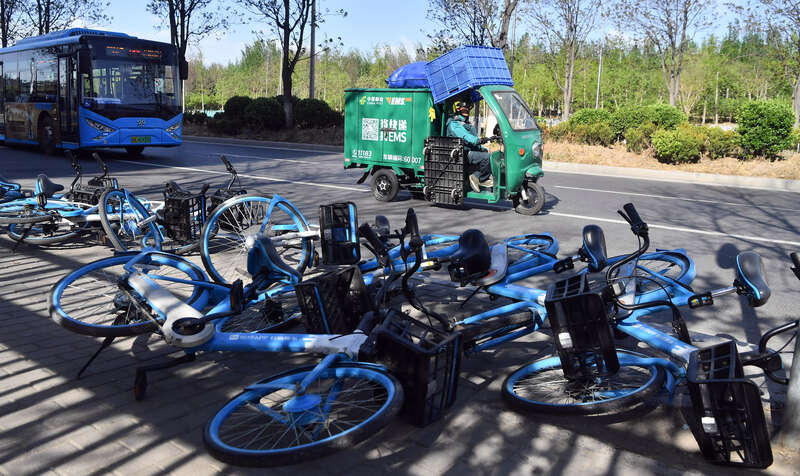 4月12日,在北京通马路,地上可见被风吹倒的自行车。