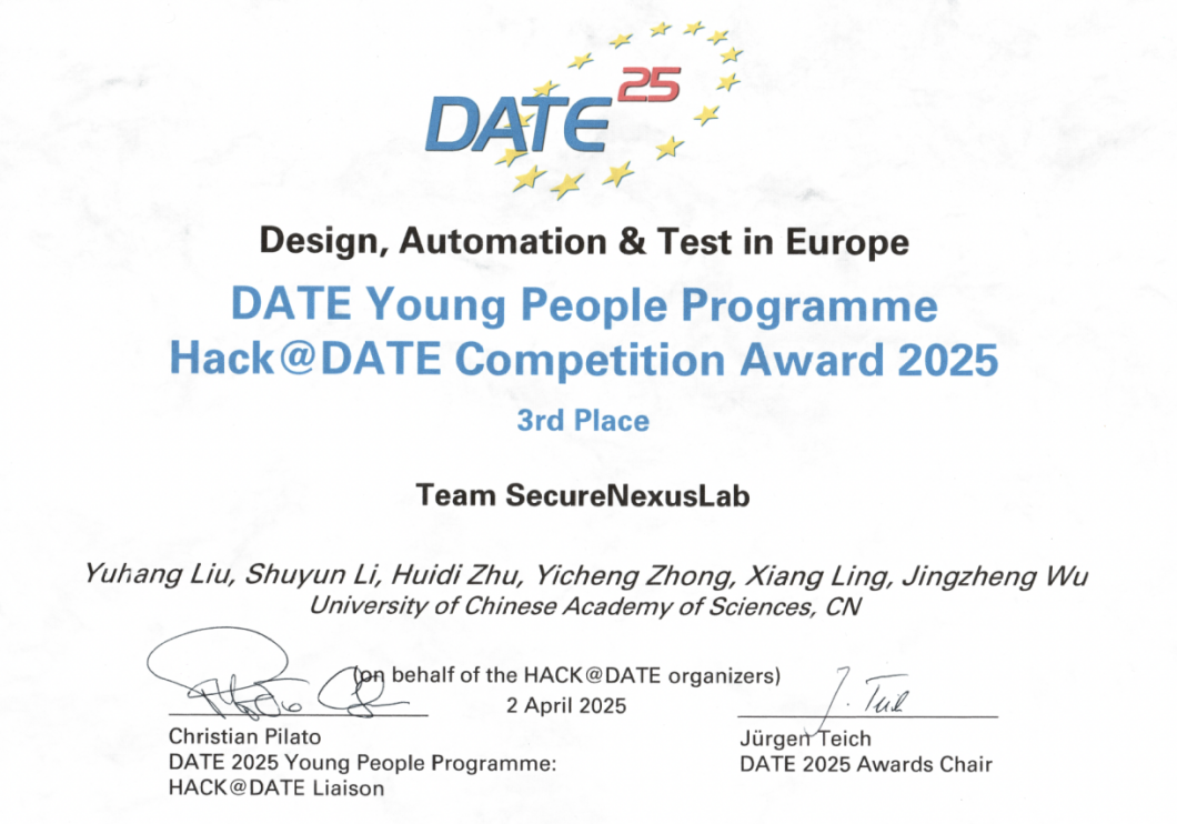 HACK@DATE 2025聚焦硬件安全漏洞挖掘,包括初赛与决赛两个阶段,共吸引来自中国、美国、英国、加拿大、印度等国家和地区的27支战队、82名安全领域研究人员参与。除软件所两支队伍外,晋级决赛的另外4支队伍分别来自纽约大学、康奈尔大学、谷歌等知名高校及企业。