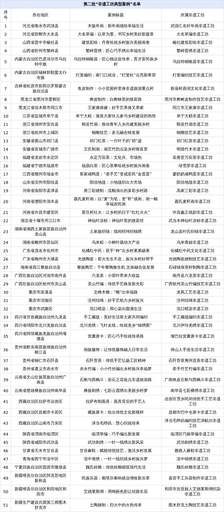 通知指出,希望各地认真学习借鉴,发挥典型案例的示范带动作用,推动非遗工坊建设提质增效,进一步发挥非遗工坊在推动非遗保护、促进就业创业、助力乡村全面振兴等方面的积极作用。