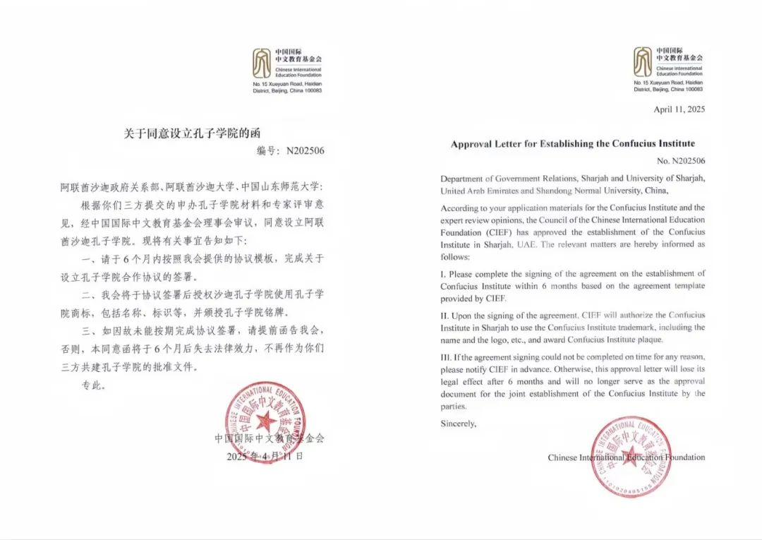 4月11日,中国国际中文教育基金会正式批准山东师范大学与阿联酋沙迦政府关系部、沙迦大学合作建设沙迦孔子学院的申请,这是学校获批的第八所孔子学院,也是在中东地区承办的第二所孔子学院。