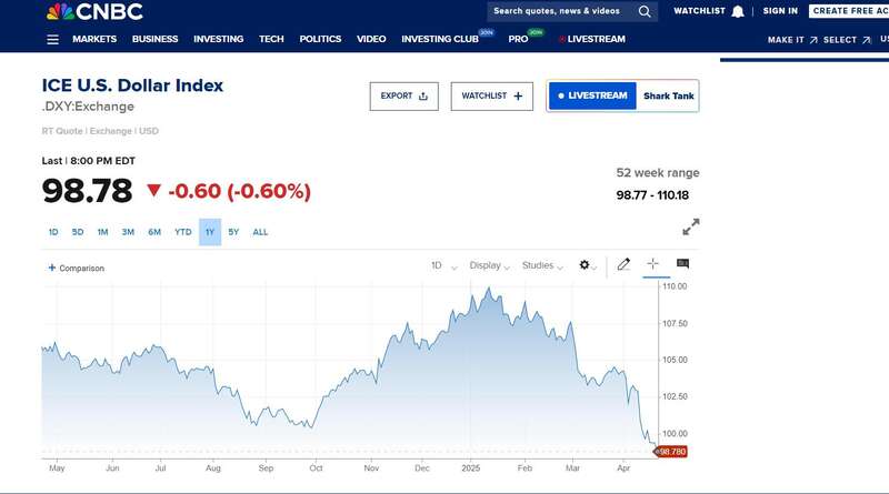衡量美元对六种主要货币的美元指数近期持续走低。截至北京时间4月21日8时,洲际交易所美元指数报98.78,跌幅0.6%,跌破99关口,为2022年4月以来首次。