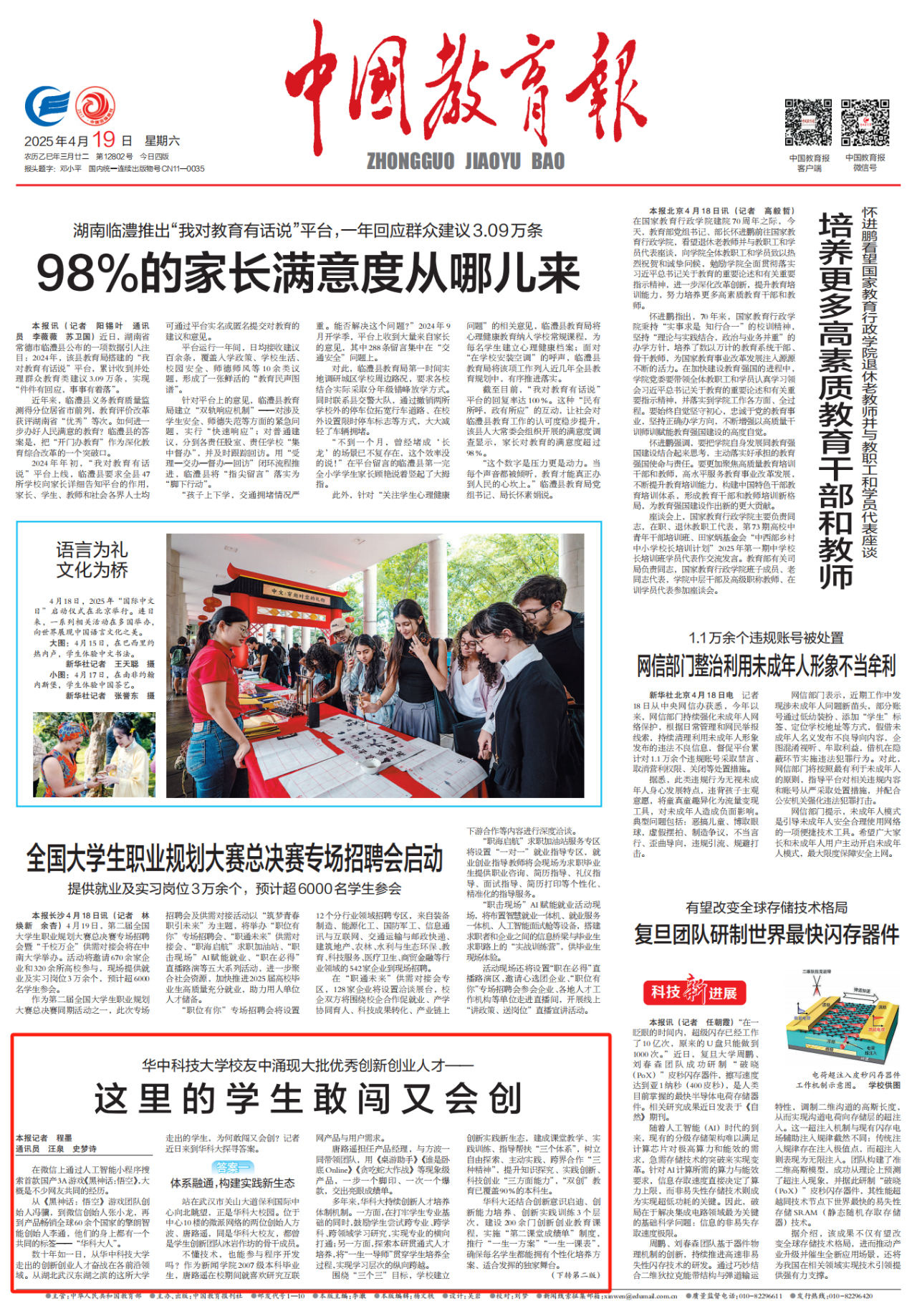 4月19日,《中国教育报》头版刊发文章《华中科技大学校友中涌现大批优秀创新创业人才——这里的学生敢闯又会创》,探秘我校创新人才培养。