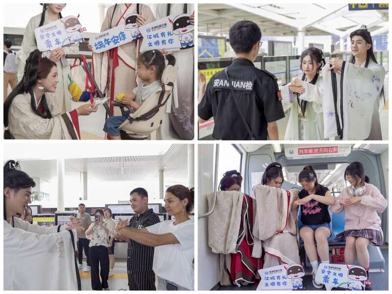 去年端午节期间,芜湖单轨还组织开展了“江城有礼 汉服有约 文明有你——穿汉服行汉礼”活动。公司青年志愿者身着传统汉服,与车站节日在岗职工及乘客亲密互动,现场教学汉礼规范,弘扬传统礼让文化的同时,引导乘客安全文明乘车。