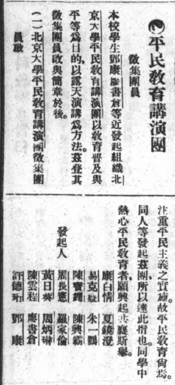 1919年3月7日,邓康、廖书仓等14名北大同学在《北京大学日刊》刊登出《北京大学平民教育讲演团征集团员》启事,发起成立“北京大学平民教育讲演团”。宣称“以教育普及及平等为目的,以露天演讲为方法”。他们认为 “共和国家以平民教育为基础”,“北京大学固以平民主义之大学为标准者也。”鉴于当时的中国平民识字的人少,能阅读印刷品出版物者只限于少数人,发起人认为“欲期教育之普及与平等,自非从事演讲不为功。”号召同学中热心平民教育的人报名加入平民教育讲演团。