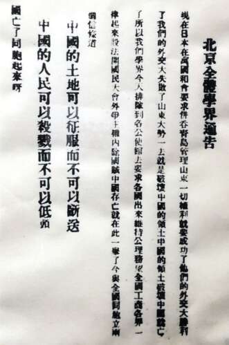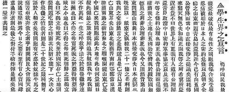 现在日本在万国和会要求吞并青岛,管理山东一切权利,就要成功了!他们的外交大胜利了!我们的外交大失败了!山东大势一去,就是破坏中国的领土!中国的领土破坏,中国就亡了!所以我们学界今天排队出行到各公使馆去要求各国出来维持公道。务望全国工商各界一律起来设法开国民大会,外争主权,内除国贼。中国存亡,就在此一举了!今与全国同胞立两个信条道: