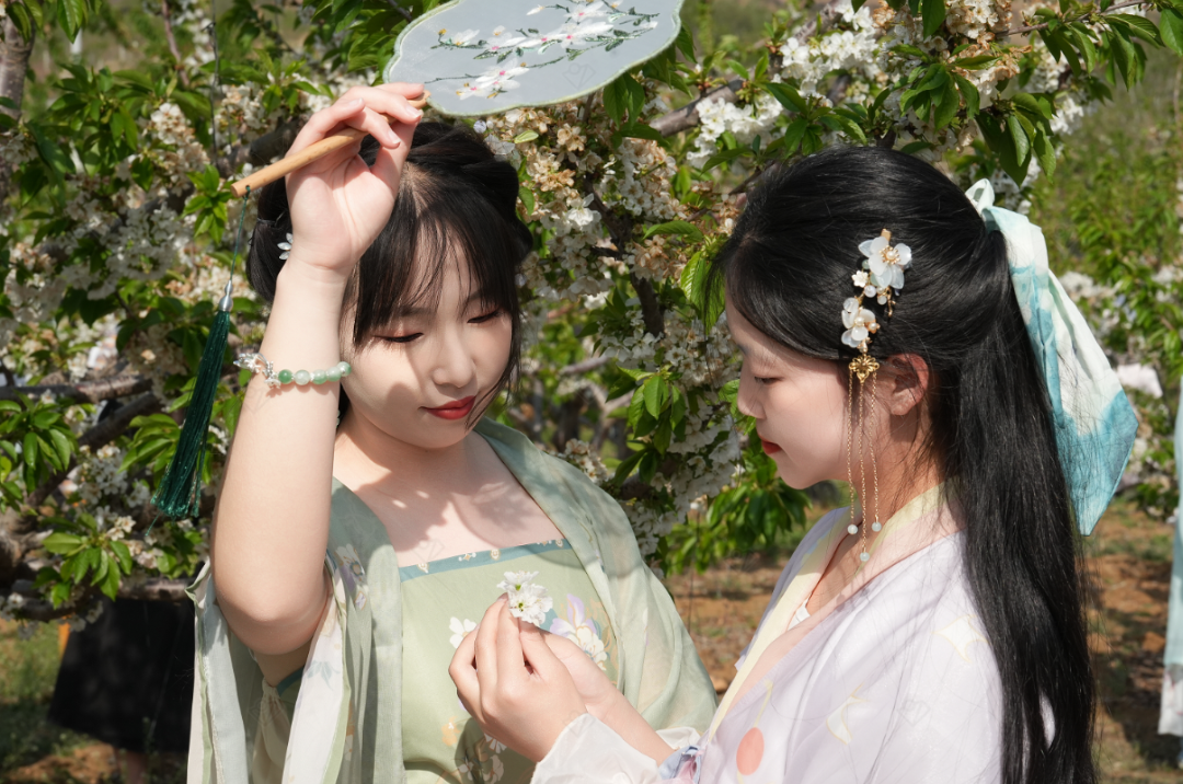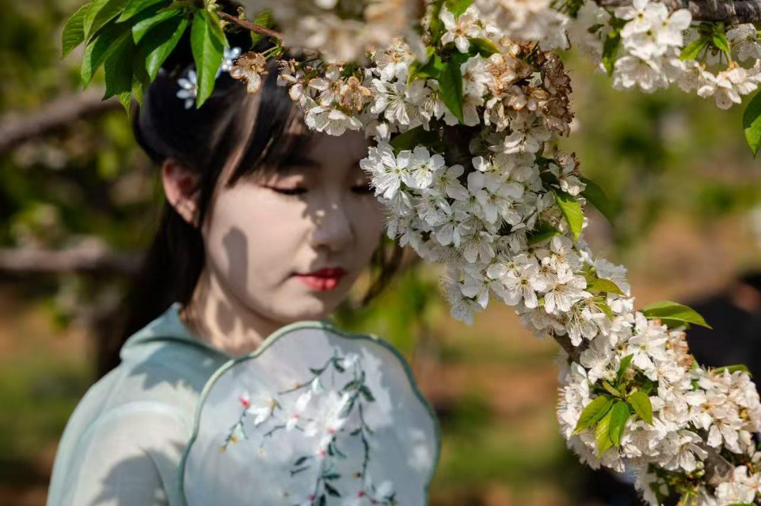 潋滟春光泼洒在山麓,五峰山街道纸坊村的樱桃园里樱花正艳。微风轻拂,花瓣如雪片纷纷扬扬飘落,如梦如幻。汉服社的同学们身着汉服漫步其中,衣袂飘飘,仿若穿越千年时光。木心摄影社的成员们则将镜头探入花影深处,快门轻响,定格下这绝美的春日图景。