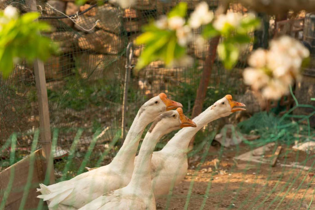 樱桃园附近是一位校友的住所,团队便应邀来到校友家中拜访。庭院中竹篱斜掩,走地鸡、大鹅自在踱步,繁花与远山呼应成景,质朴宁静的氛围让大家沉醉。