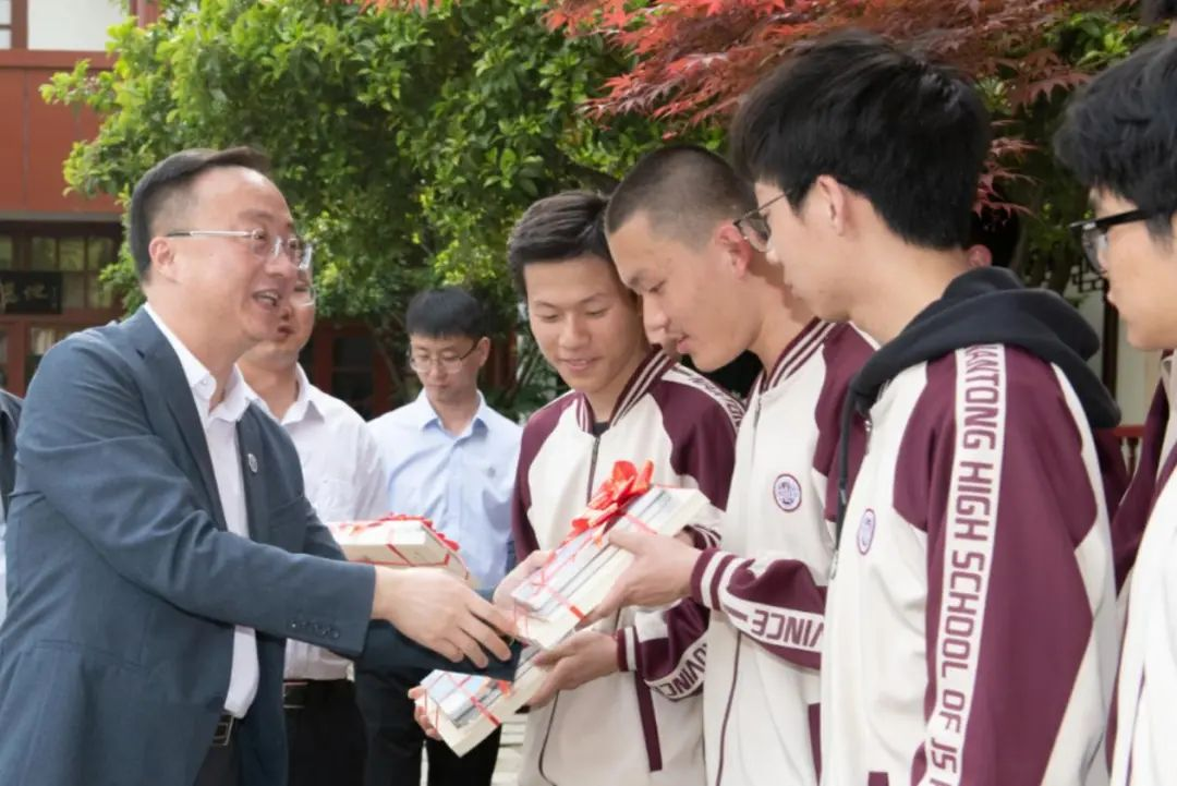 座谈会后,赵宏伟一行赴南通中学调研,参观了南通中学校史馆,与南通中学校长陈建云等领导、老师开展交流。赵宏伟为高三同学赠送中国矿大相关书籍,并与学生亲切交流,勉励学生志存高远,刻苦学习,早日成才。