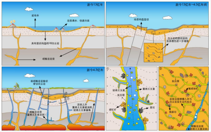 至此,研究团队提出了白云鄂博稀土成因新模型:中元古代的碳酸岩岩浆喷发至附近盆地,低粘度的岩浆与盆地水混合并冷却形成具有层状构造的H8白云岩,构成赋矿围岩的主体。约9亿年后,早古生代碳酸岩以岩脉形式侵入白云岩及其覆盖的沉积地层,并携带大量富稀土元素的碱性流体。流体上升过程中,其所含的重稀土元素与周围的含硅围岩反应被消耗,导致轻稀土元素含量升高,最终在与白云岩的交代反应过程中发生大规模稀土矿化。