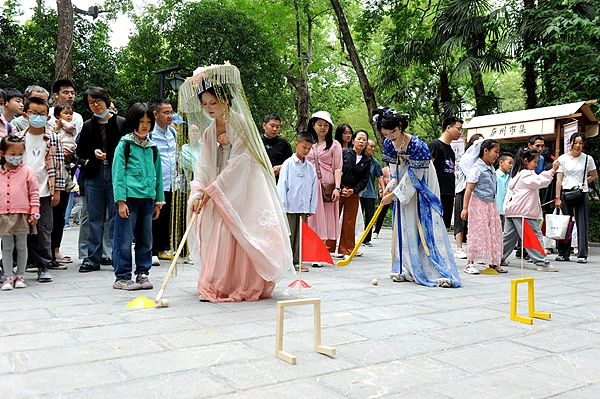 2025年5月3日,安徽省合肥市包公园景区,游客正在参与“捶丸”趣味游戏。参加古风运动会,体验古代趣味体育游戏,感受传统文化独特魅力。