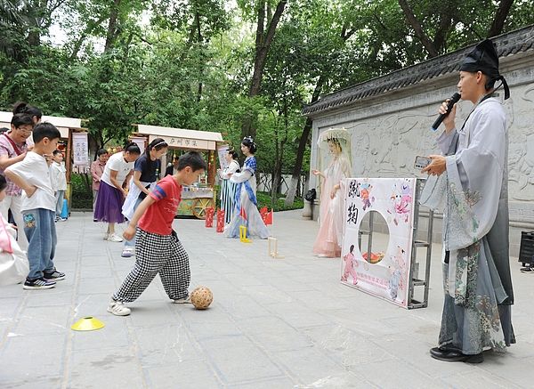 2025年5月3日,安徽省合肥市包公园景区,游客正在参与“蹴鞠”体育活动。参加古风运动会,体验古代趣味体育游戏,感受传统文化独特魅力。