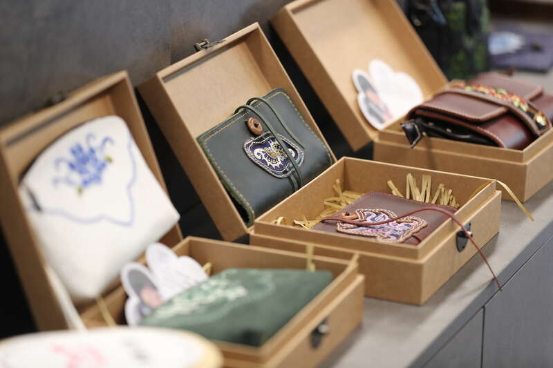 在展厅参观时,陈孟丽向中青报·中青网记者展示工坊的创新:将黎族纹饰和旗袍、马面裙、礼服等服装结合;服装面料从原先的棉麻扩展到羊毛等其他材质;产品种类从服装拓展到文创领域,包括包、相框、发饰……